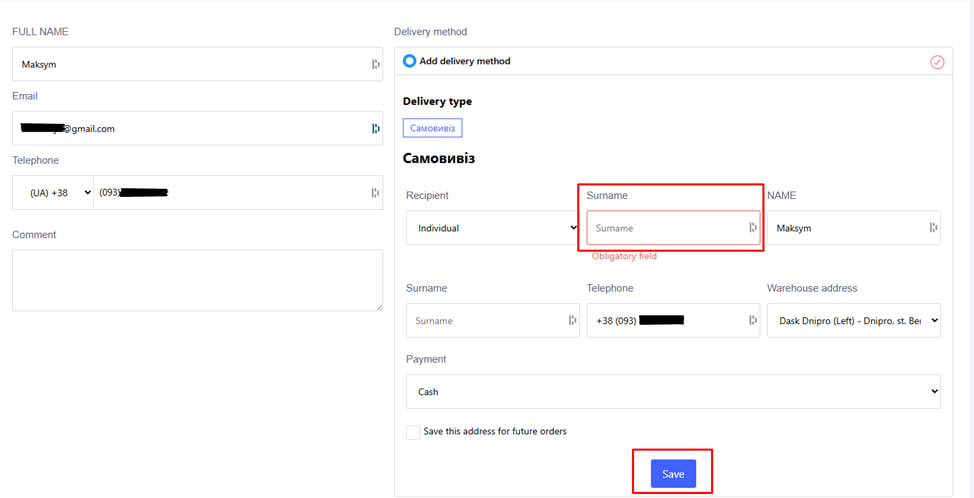 - Wählen Sie eine Liefermethode (wenn das Unternehmen verschiedene Arten anbietet);