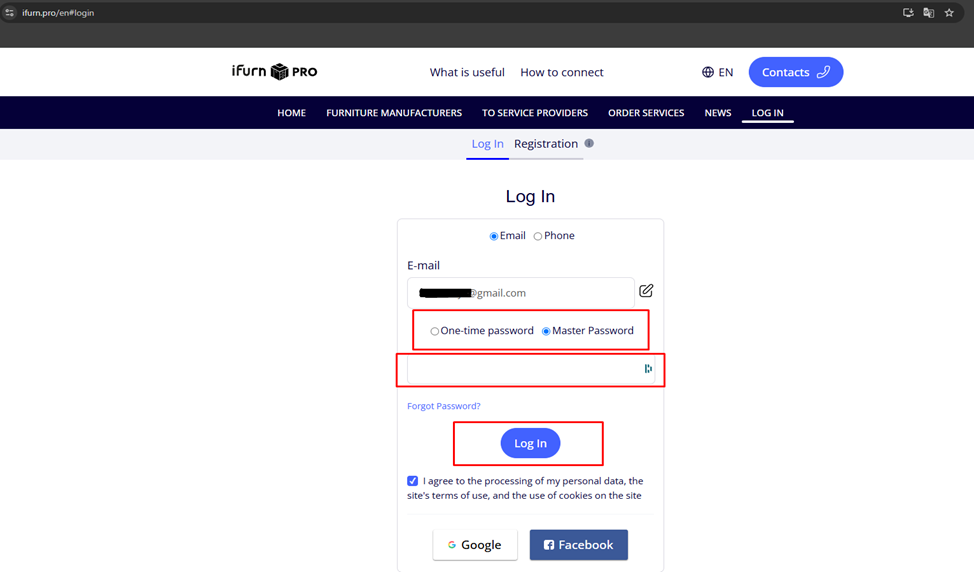 Geben Sie Ihre E-Mail-Adresse ein, die Sie bei der Registrierung im iFurn.pro-Portal angegeben haben