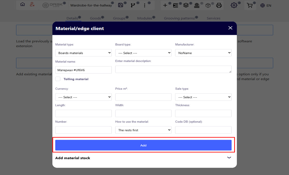 Die Länge und Breite des Plattenmaterials wird durch die Größe des gesamten Blattes angegeben. Wenn Sie Stücke ( Reste ) von Plattenmaterial hinzufügen müssen, befindet sich ganz unten eine Vorlage zum Hinzufügen solcher Reste.