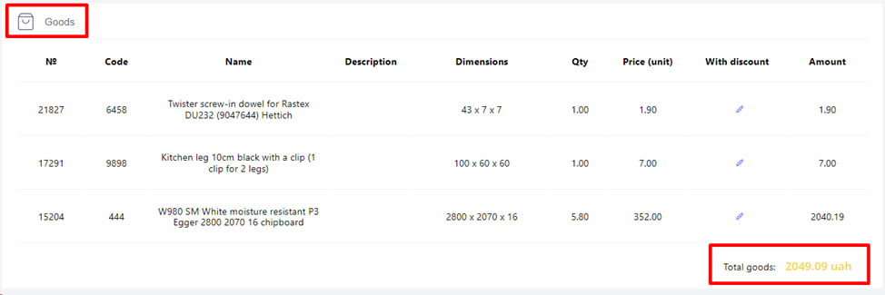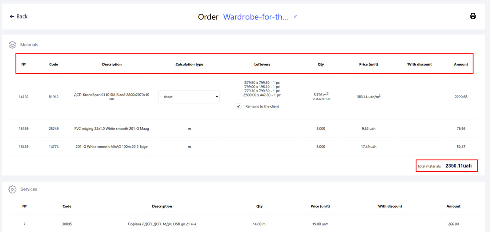 - Bei der Materialberechnung wird Folgendes angezeigt : die Art der Materialberechnung (Quadratmeter, ganze Platte), die Menge und die Kosten jedes einzelnen Materials (Kante, Plattenmaterial) und am Ende die Gesamtkosten aller Materialien. Beim Ändern der Art der Materialberechnung ändern sich die Materialkosten automatisch .