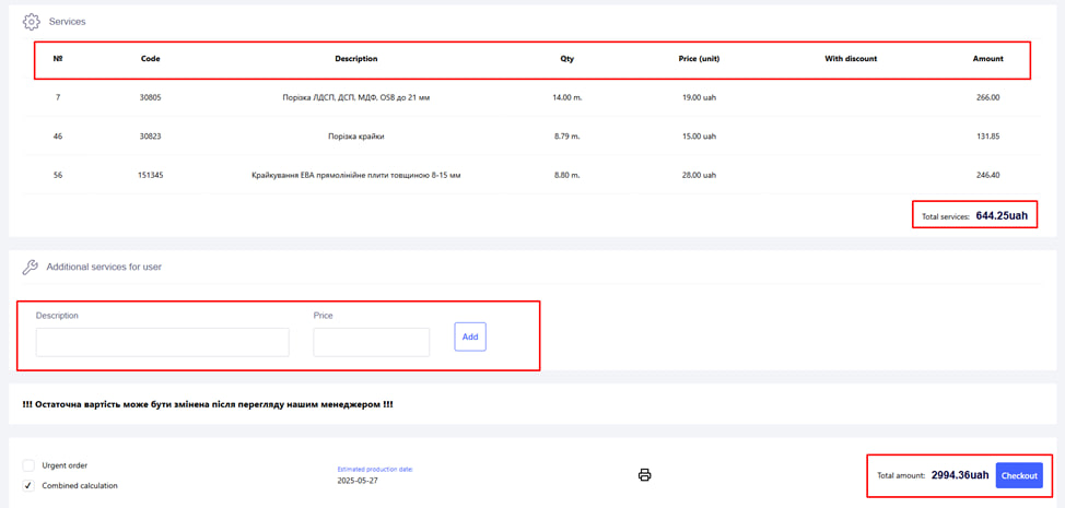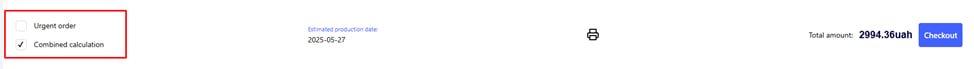 Über die Schaltfläche „Berechnung“ können Sie einen Bereich öffnen, in dem Sie die Gesamtkosten der Bestellung vor der Bestätigung einsehen können. So können Sie den endgültigen Betrag des Projekts unter Berücksichtigung von Materialien , Salden , Dienstleistungen und ausgewählten Produktionsparametern detailliert abschätzen.