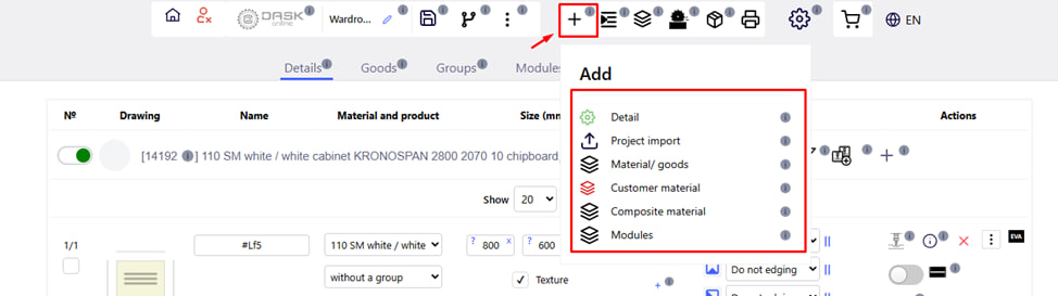 - Add details. The " Detail " button is used to add a new detail to the project. By clicking it, you open the " Add new detail " template, where you need to specify a name, select a material, set the length and width, and determine the number of details.