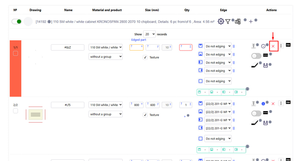 - Click on the red cross located on the right side of the row of a specific detail.