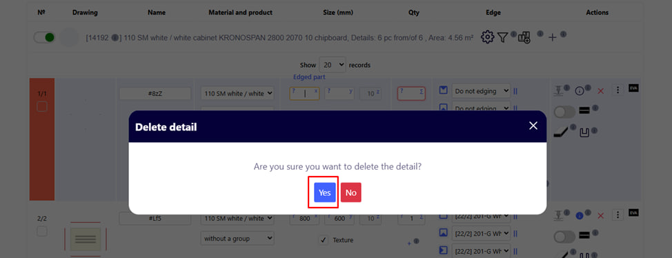 Attention : After deletion, the detail is not saved in the change history — it completely disappears from the project. If the deletion was incorrect, you will have to enter this detail again.