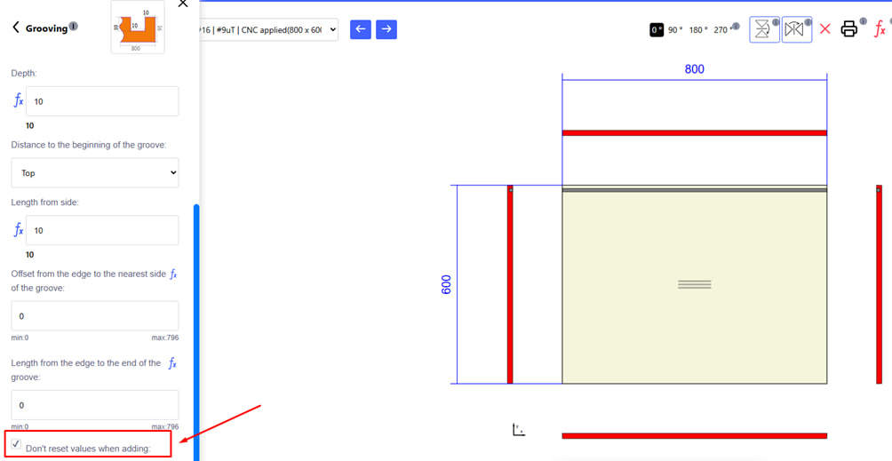 If the check box is checked , the system does not clear the input fields after clicking the Add button. This is convenient when you need to create several grooves with the same parameters - just indicate the new position of the groove in the drawing.