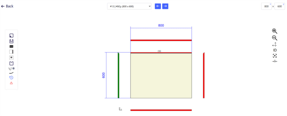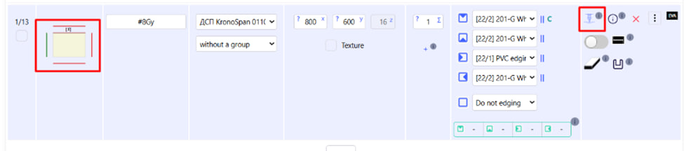 This button opens the interface for editing CNC operations for the selected part. You can click both on the icon with the cutter itself and on the image of the part , which will open the same window. On the detail editing page, you can enlarge/ reduce the drawing, display all segments with IDs and coordinates , and perform CNC operations.