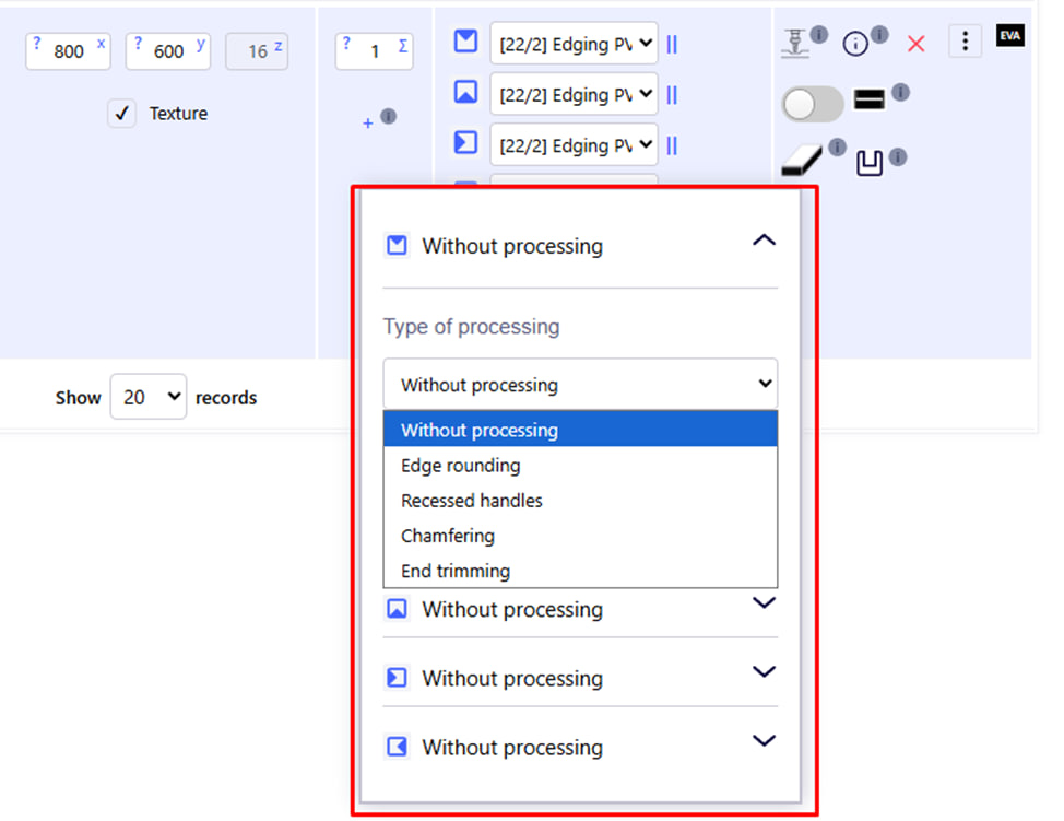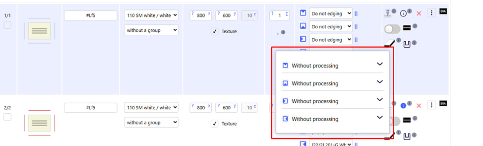 The End processing button opens a menu in which you can set the type of processing for each end of the part separately.