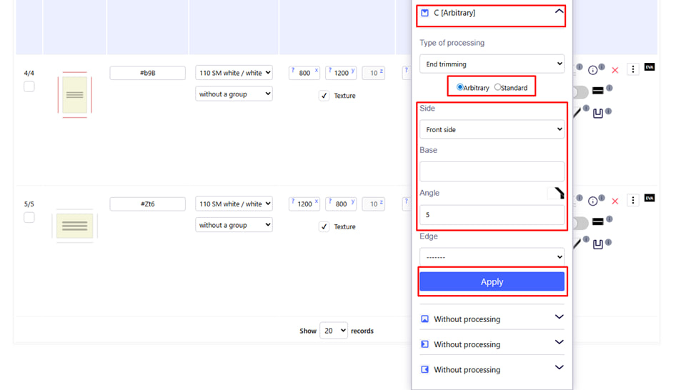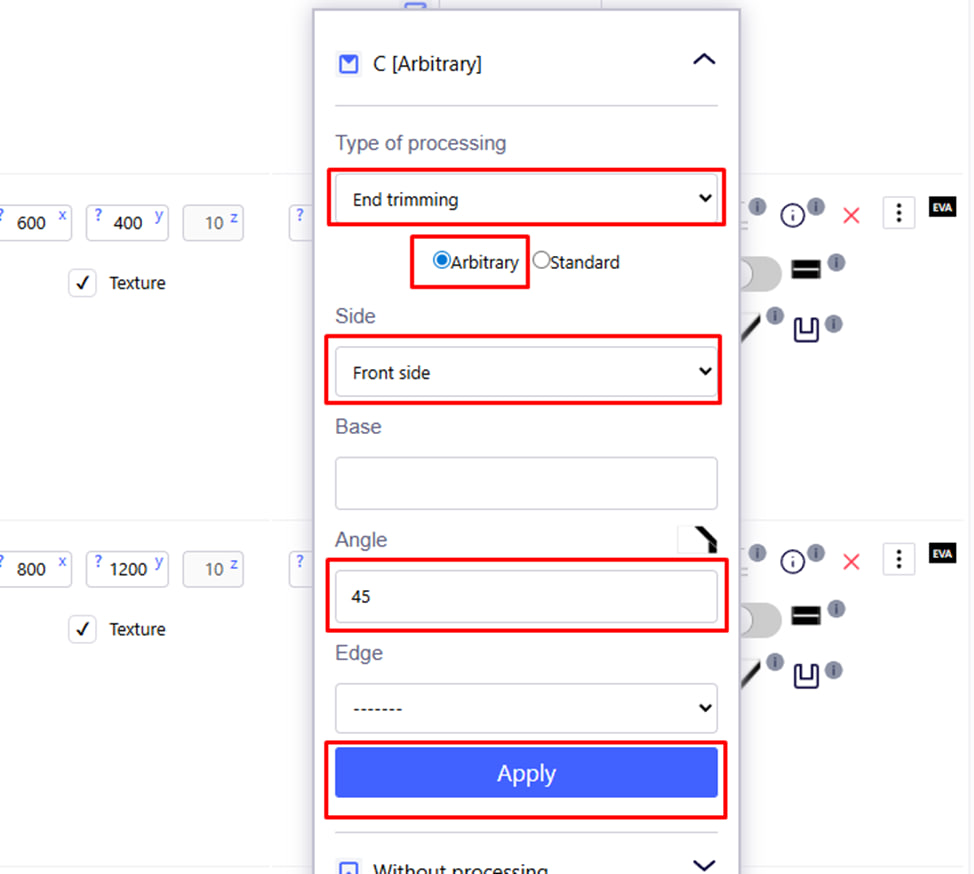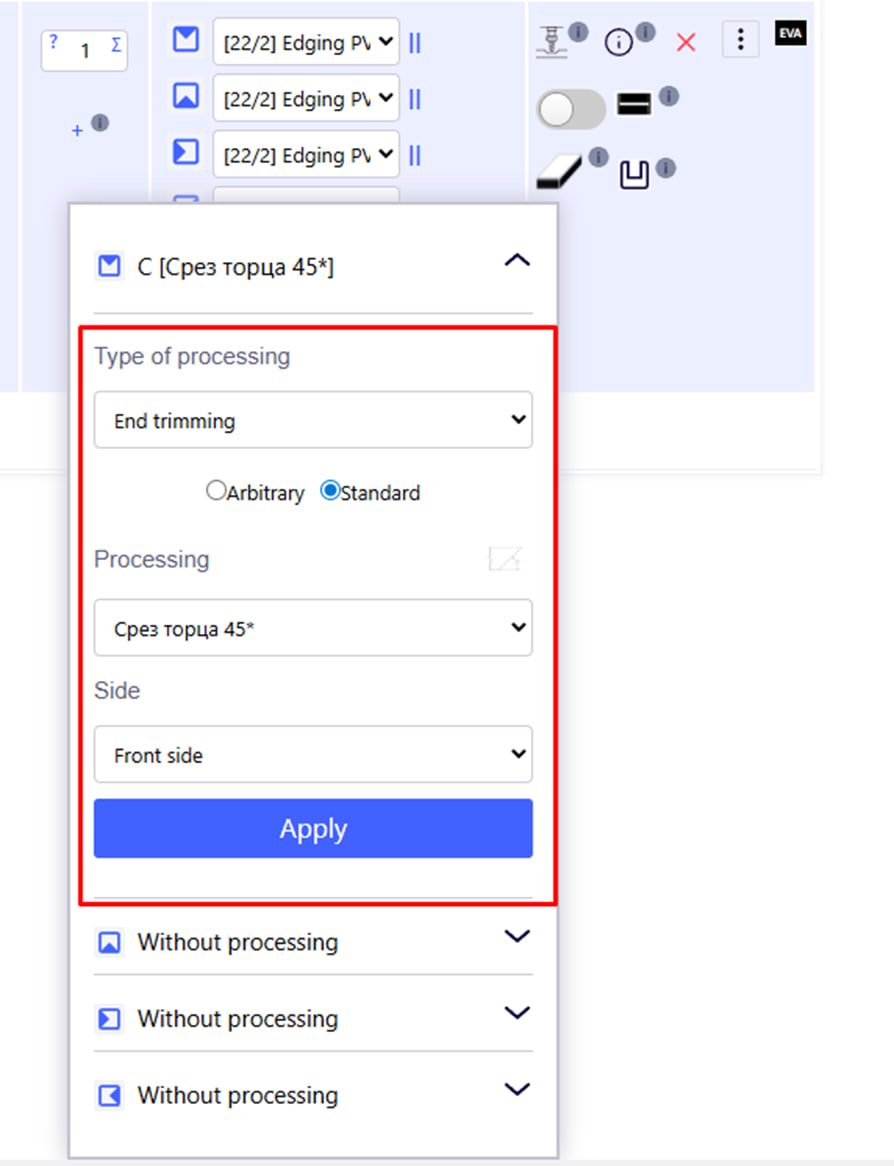 After filling in all the fields, click the Apply button - the changes will be applied to the selected side of the part.