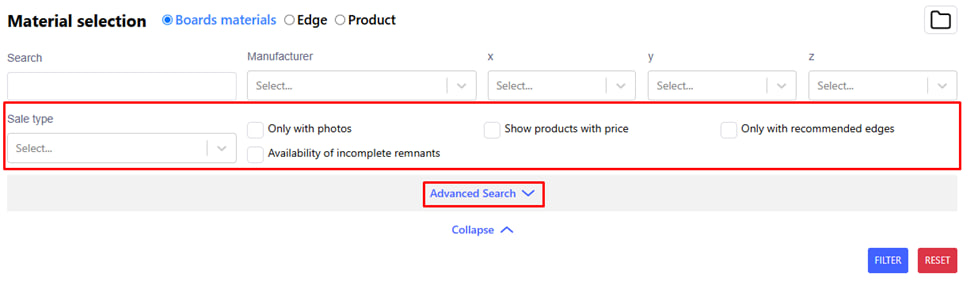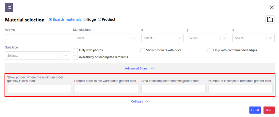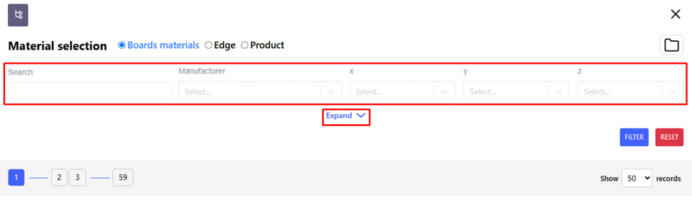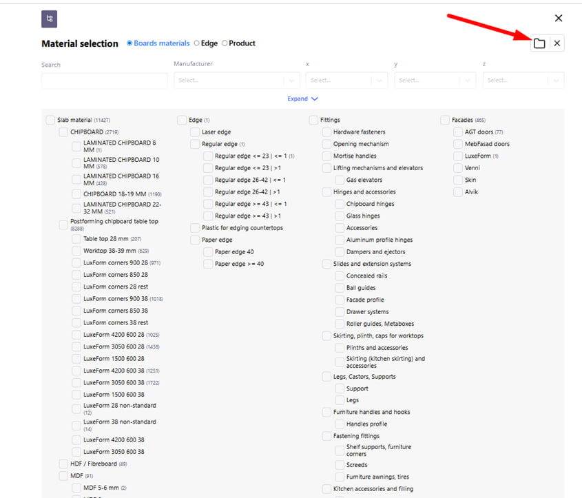 You can use filters for a convenient search. For example : search by length or width. When selecting a material thickness, for example, 0.45 mm, after clicking " filter " you will see the possible filter values within this selection. With the following filtering, you are guaranteed to find the right position.