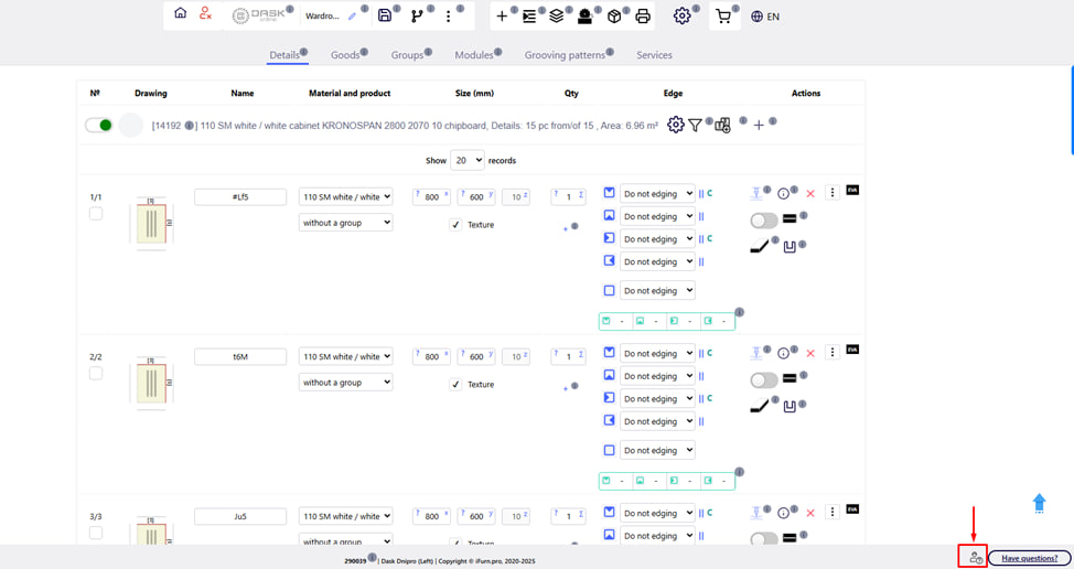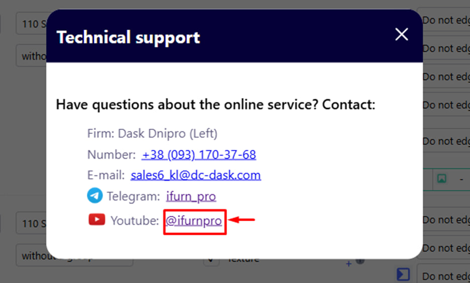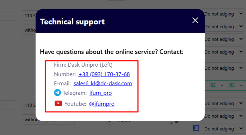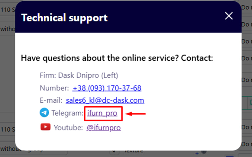 In the lower right corner of the main page of the project creation, there is a " Technical support " button. It allows you to quickly contact the support service of the company or the iFurn.pro platform in case of technical difficulties, errors or questions that need clarification.