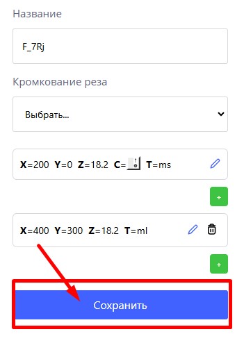 To display the resulting cut on the part, you need to confirm the data entry by clicking on the "Save" button
